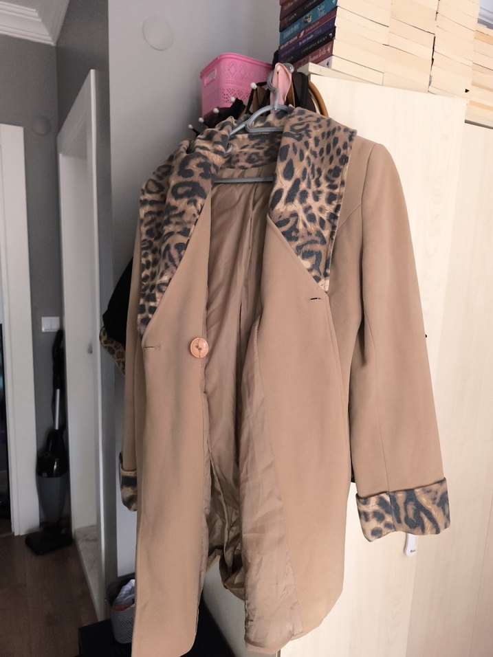 Leopar desenli kürk detaylı, geniş kesim midi uzunlukta kaban. Bej ve gri tonlarında, günlük kullanım için uygundur.