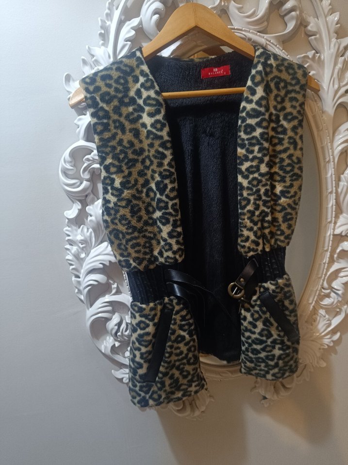 Kısa kesim, halter yakalı ve leopar desenli bu yelek, kürk detaylarıyla dikkat çeker. Yumuşak ve sıcak dokusuyla dış mekan sokak stiline uygundur.