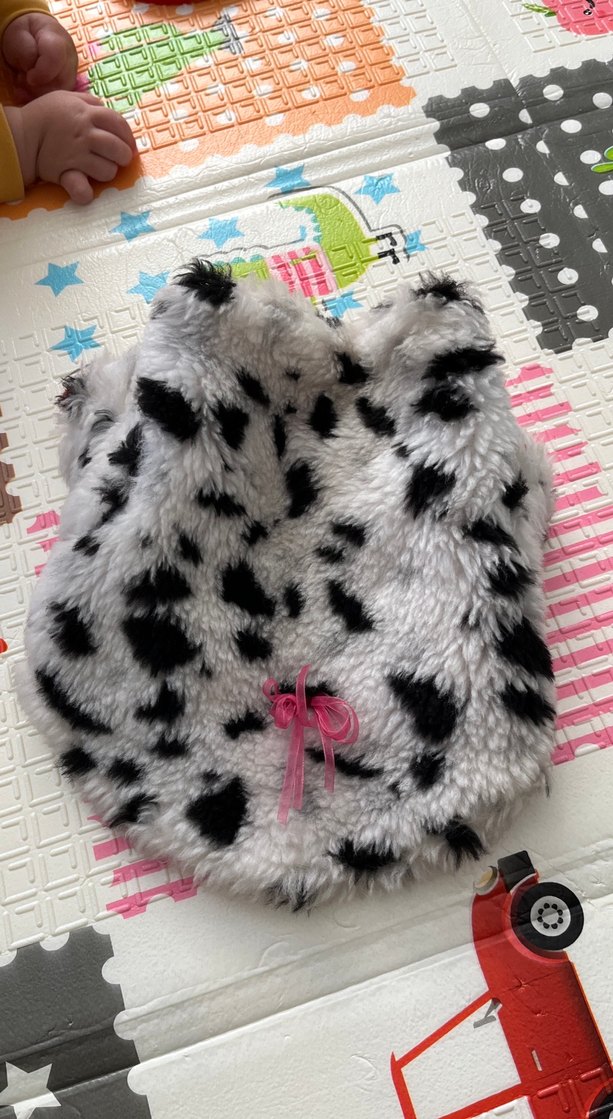 Leopar desenli, renkli gri kürklü kumaştan yapılmış rock punk tarzı kedi kıyafeti. Yumuşak dokulu ve küçük pembe fiyonk detaylı. 3 kg kadar olur