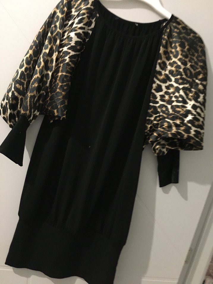 Siyah midi boy, straplez yakalı elbise; leopar desenli, kürklü uzun kollu ve bol kesimdir.