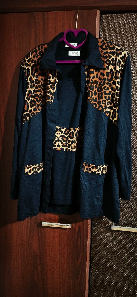 Kadınlar için uzun, bol kesim lacivert ceket, yakasında ve ceplerinde leopar desenli detaylarıyla sokak stilini ve rahatlığı birleştirir. omuzlarında vatka vardır temiz kullanılmadı sıfır defosu yoktur büyük beden ölçülerini koydum