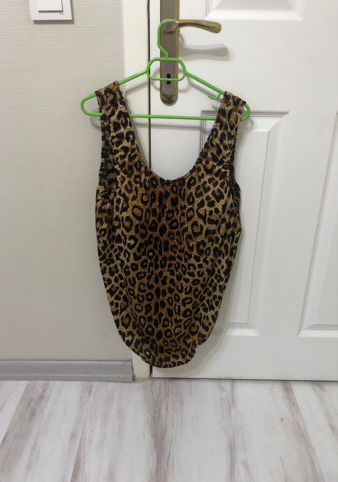 Leopar desenli iki parça mayo ve şorttur büyük bedendir esnek kumaşı vardır 100 & 110 kg olan kullanabilir sadece bir sezon giyildi beli lastik çevresi 80 santimdir 140 santime kadar lastik genişleyebilir. Mayo içinde kap bölümü vardır. Shirt uzunluğu Bella’stiğinden alta kadar 50 santimdir
