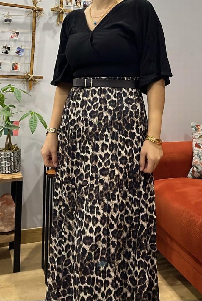(1 kere tanışmada giyildi ) KEMERSIZ Leopar desenli etek kısmı ile sokak stili ve trend bir görünüm sunar. Günlük kullanıma uygun yumuşak dokulu sentetik kumaştan yapılmıştır.