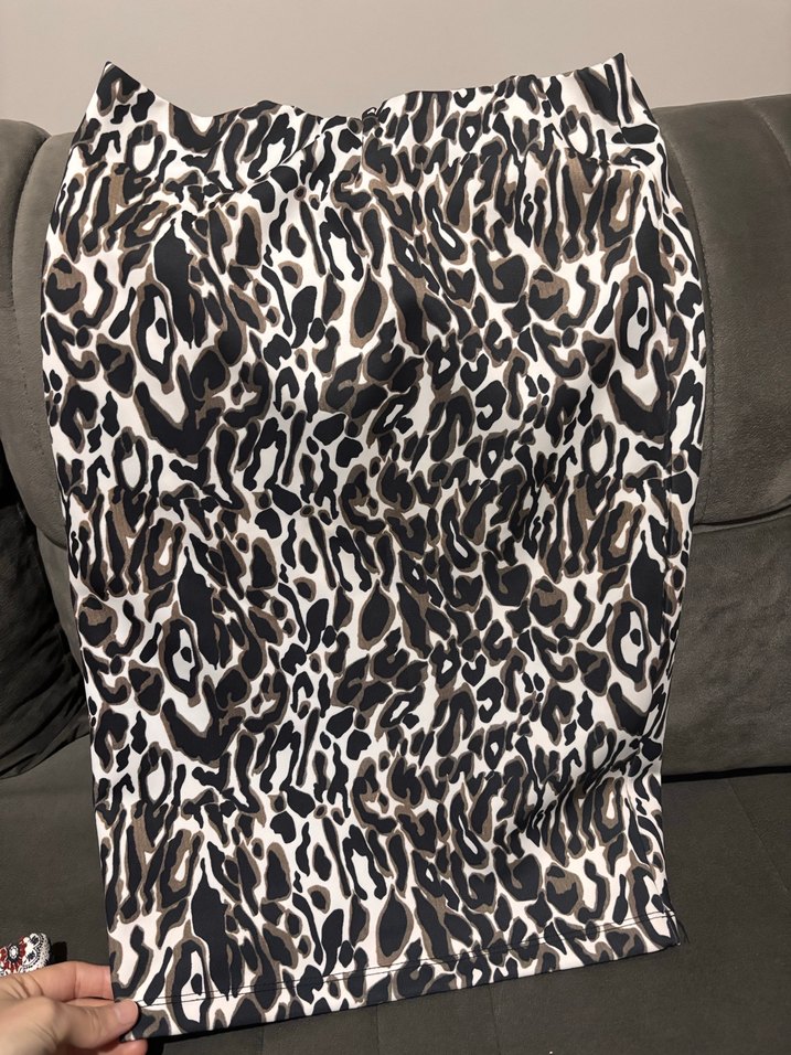 Kahverengi yılan desenli, kürk detaylı, yumuşak sentetik kumaştan yapılmış, normal boyda, dar kesim hamile eteği. Rahat ve günlük kullanıma uygun. Hic kullanılmadı 36 beden