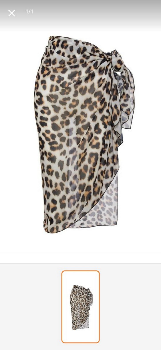 Leopar desenli kahverengi midi pareo, drapeli ve bol kesimlidir. İnce askılı, bohem tarzda cesur ve çağdaş bir görünüm sunar.