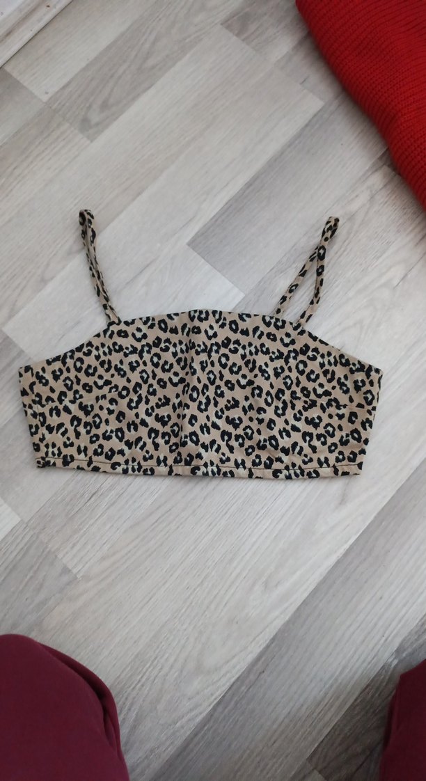 İnce askılı, leopar desenli açık bej mini sütyen, minimalist sokak stili için uygun.
