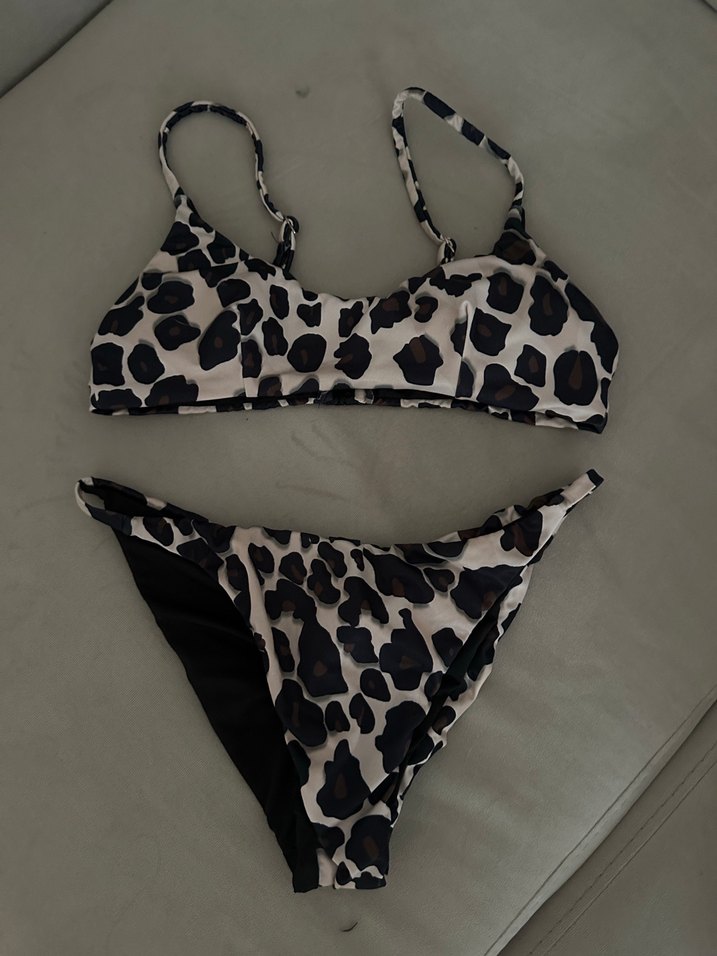 Koyu kahverengi leopar desenli, ince askılı ve mini boy bikini takımı. Üst kısım xs alt kısım s bedendir