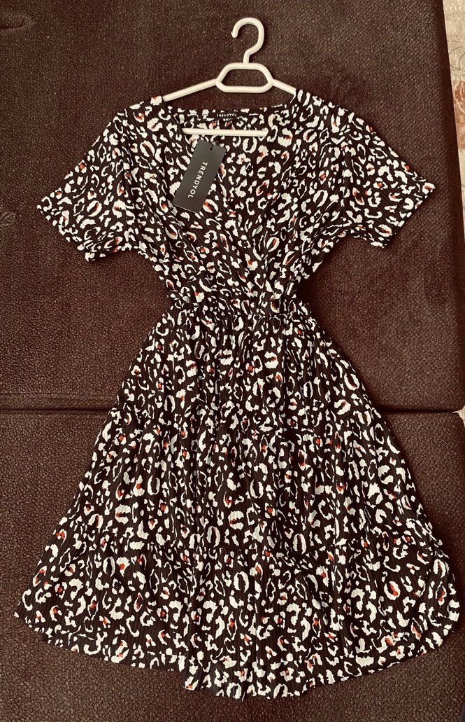 Bohem tarzı, kısa kollu, V yakalı, bol kesim mini elbise. Sentetik kumaş, kahverengi leopar desenli ve fırfır detaylıdır. Yenidir etiketi üstündedir ve hiç giyilmemiştir.