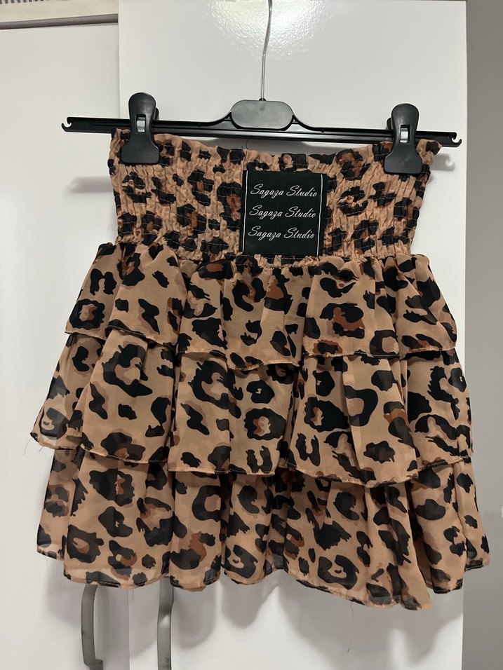 Kahverengi leopar desenli, volanlı, bol kesim mini etek. Yumuşak sentetik kumaştan, cesur ve Paris tarzı sokak giyimine uygun.