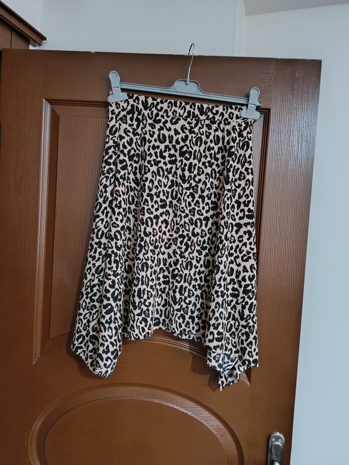 Leopar desenli, bol kesim ve drapeli kahverengi hamile eteği. Yumuşak sentetik kumaştan, bohem ve rahat sokak stili için uygun.