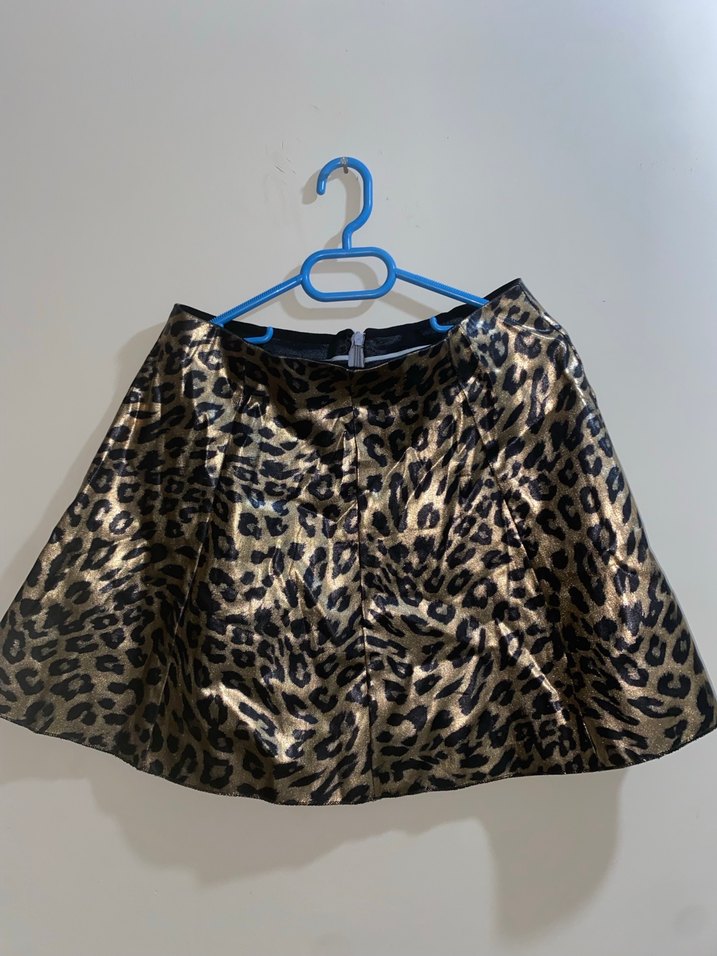 Dökümlü ve bol kesim, koyu kahverengi leopar desenli kısa mini etek.