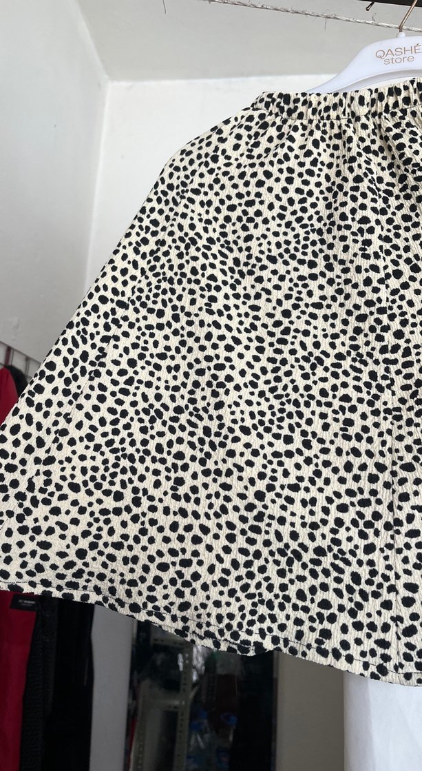 Leopar desenli, bol kesim ve fırfır detaylı mini hamile eteği. Sentetik kumaştan, günlük kullanım için uygun, çağdaş Paris tarzında.
