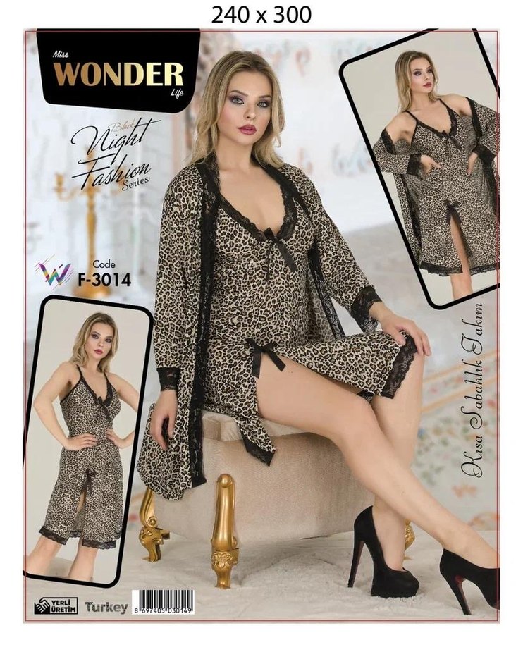 Leopar desenli, kısa ve bol kesim askılı üst ile şort ve uyumlu sabahlıktan oluşan kahverengi kadın pijama takımı. Türkiye üretimi, Wonder markası.
