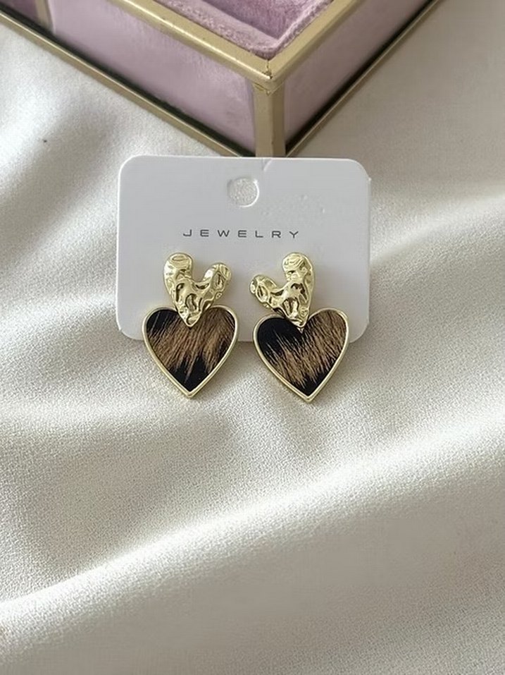 Parlak, mini kalp şeklinde, leopar desenli ve kürk detaylı bu küpeler, bohem tarzı ve cesur görünümü romantik gecelere taşıyor.