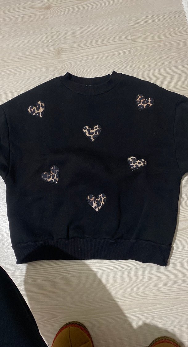 Siyah, yuvarlak yaka, uzun kollu sweatshirt. Üzerinde leopar desenli işleme ve payet detayları bulunur. Bol kesim ve yumuşak, sıcak kumaş içerir.