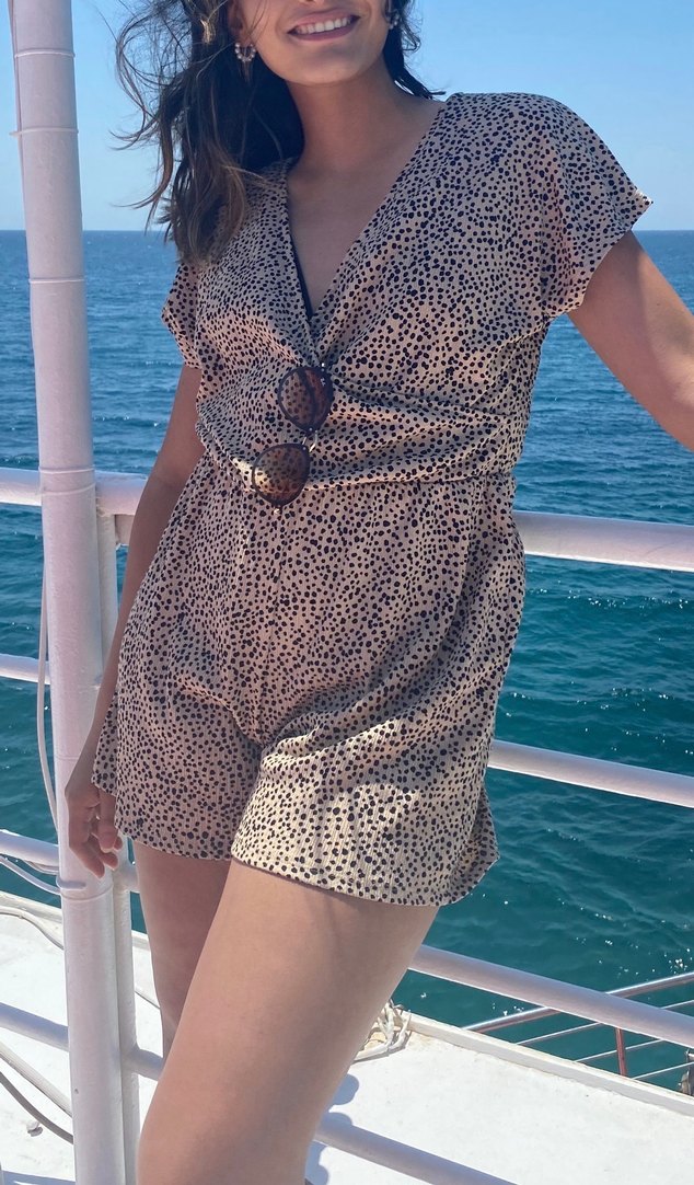 Kemerli, V yaka, ince askılı, leopar desenli kahverengi parlak mini tulum. L beden temizdir