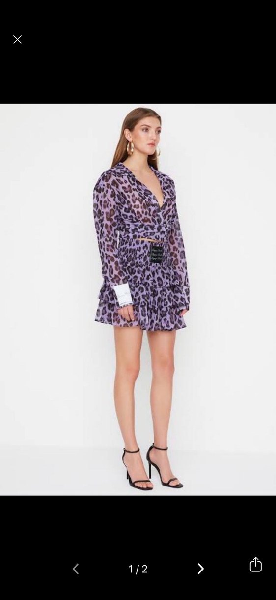 Mor renkte, leopar desenli mini elbise uzun kollu ve V yakalıdır. Kemerli bel detayıyla rahat bir kesime sahiptir. Sentetik kumaştan üretilmiştir, cesur sokak stili için uygundur.