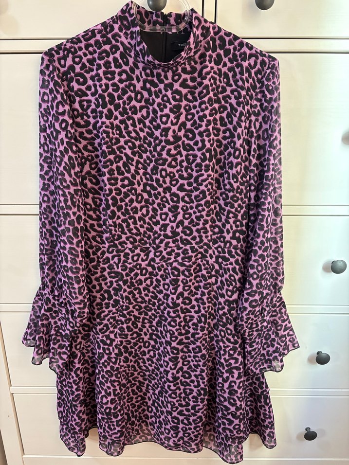 Bol kesim, yüksek yakalı ve uzun kollu, fırfırlı detaylara sahip, mor leopar desenli elbise. 1 kere giyildii.