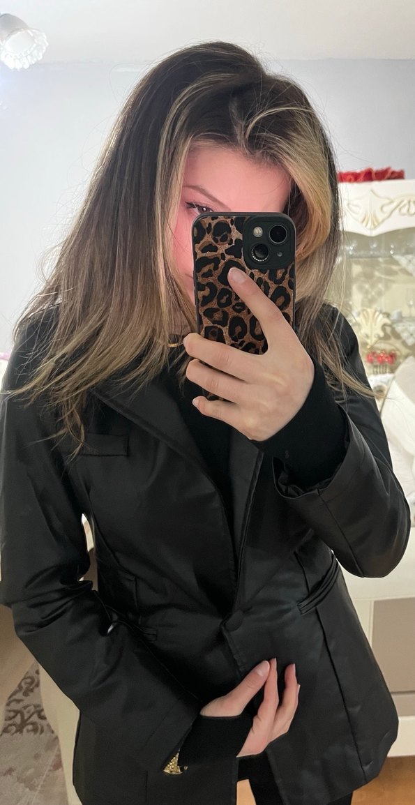 Leopar Desenli Parlak Siyah Deri Ceket
