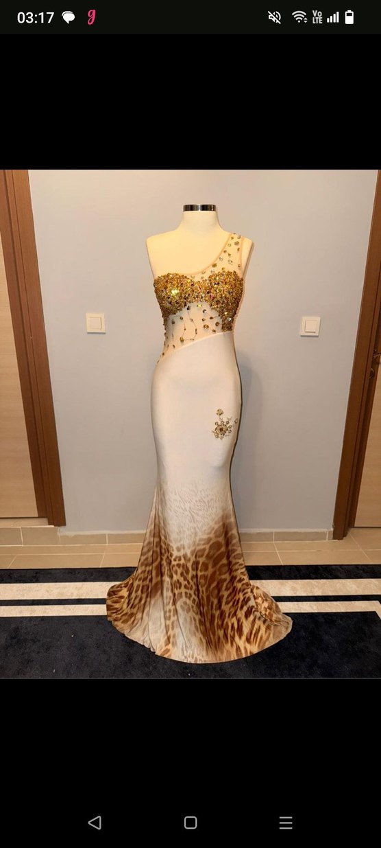 Açık bej renkli, straplez ve kolsuz, payetli üst kısmı ve etek ucunda leopar desenli, uzun ve vücuda oturan modern abiye elbise. ✨