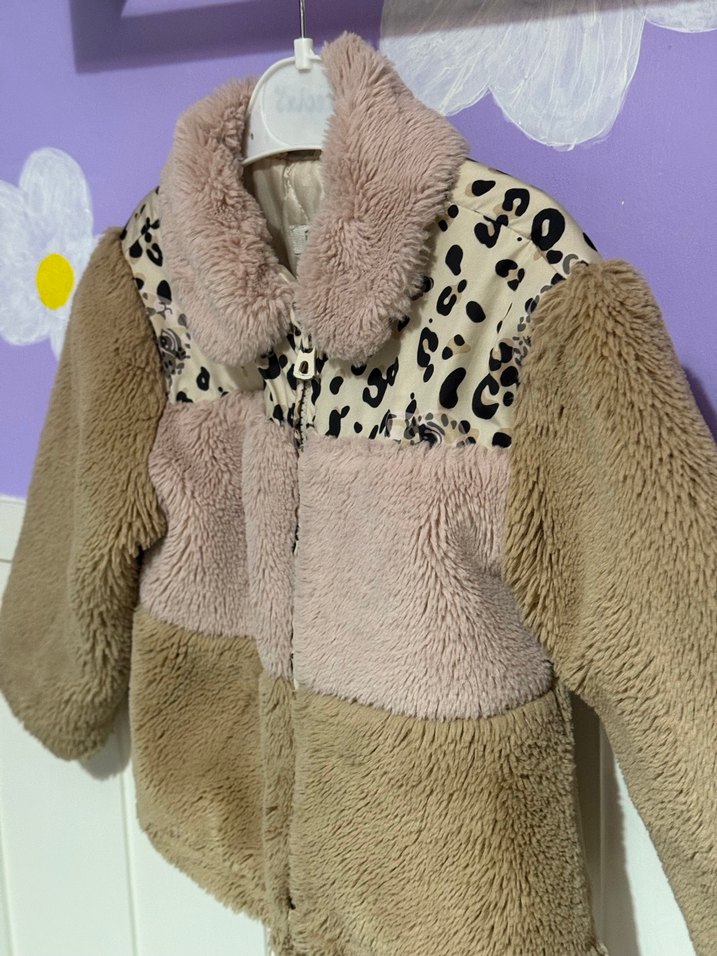 Temiz kullanıldı defosu yoktur Leopar desenli, peluş kumaştan yapılmış, bol kesim ve yakalı kız montu. Pastel kahverengi ve kürk detaylıdır, bohem tarzına uygundur.