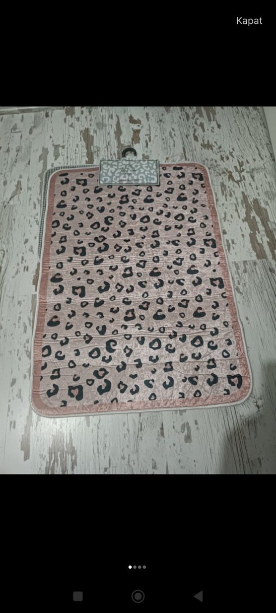 Gri leopar desenli, pembe zeminli, yumuşak ve rahat bir banyo paspasıdır.