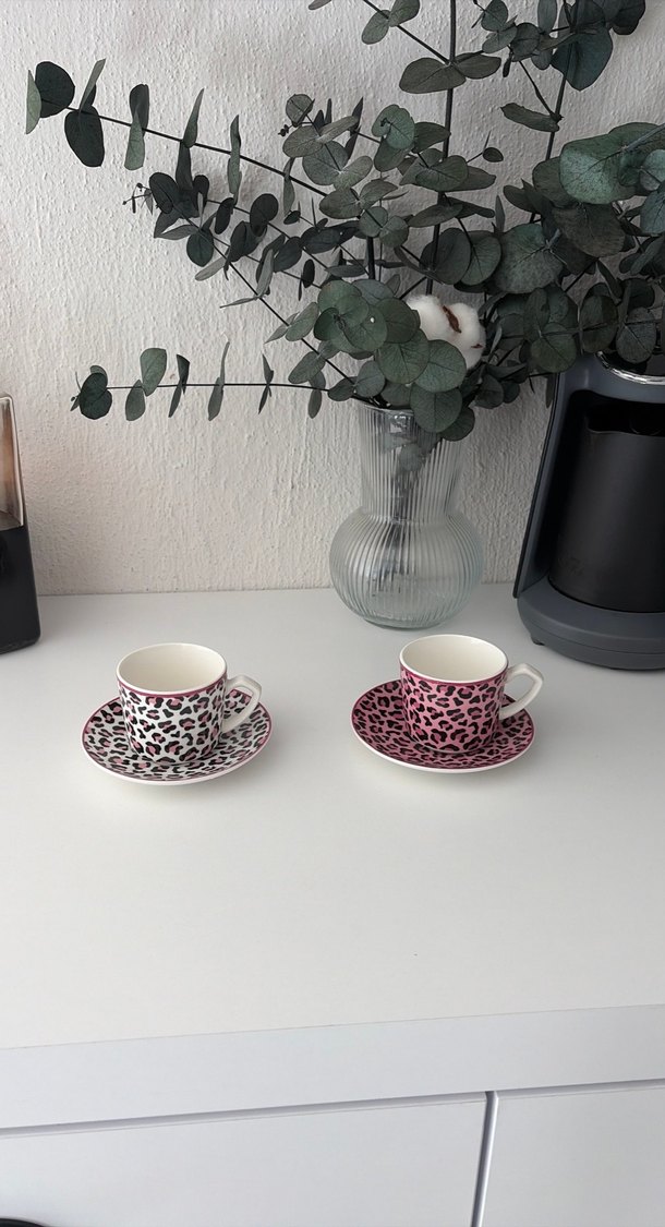 Leopar desenli, renkli kahve fincanları ve tabakları, espresso servis için uygundur. ☕ pazarlık yapılır