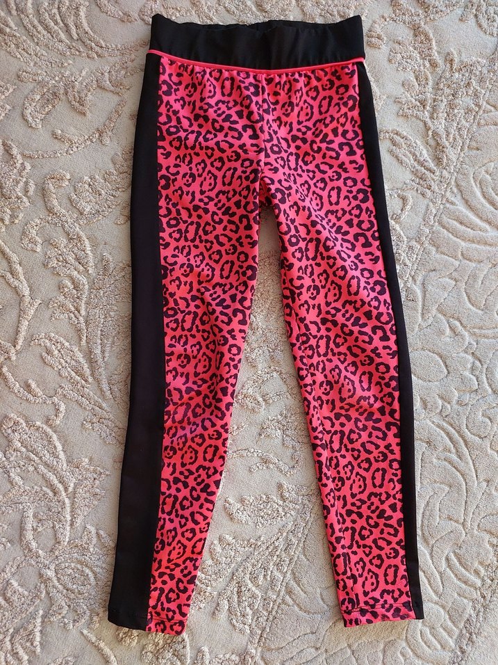 Renkli pembe leopar desenli, yanları siyah şeritli, esnek kız taytı çok temiz kullanıldı