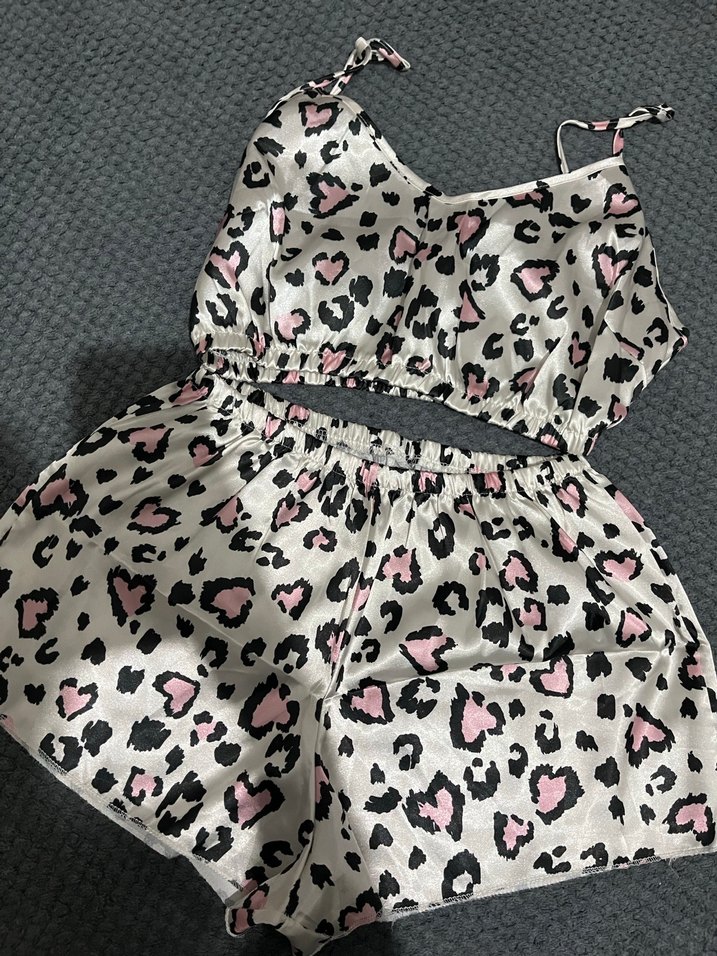 Leopar desenli, askılı üst ve şortlu, bol kesim pembe ve gri kadın pijama takımı. Rahat ve konforlu, sokak stili için uygundur.