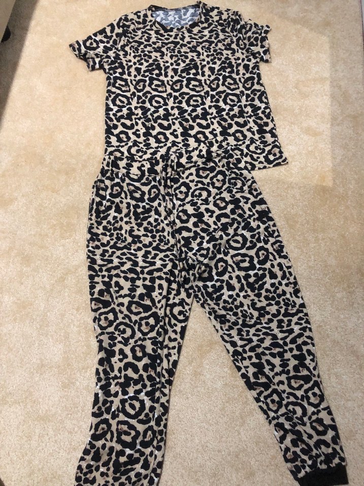 Leopar desenli, kısa kollu, yuvarlak yakalı, bol kesim penye takım m/L uygun sorunsuz