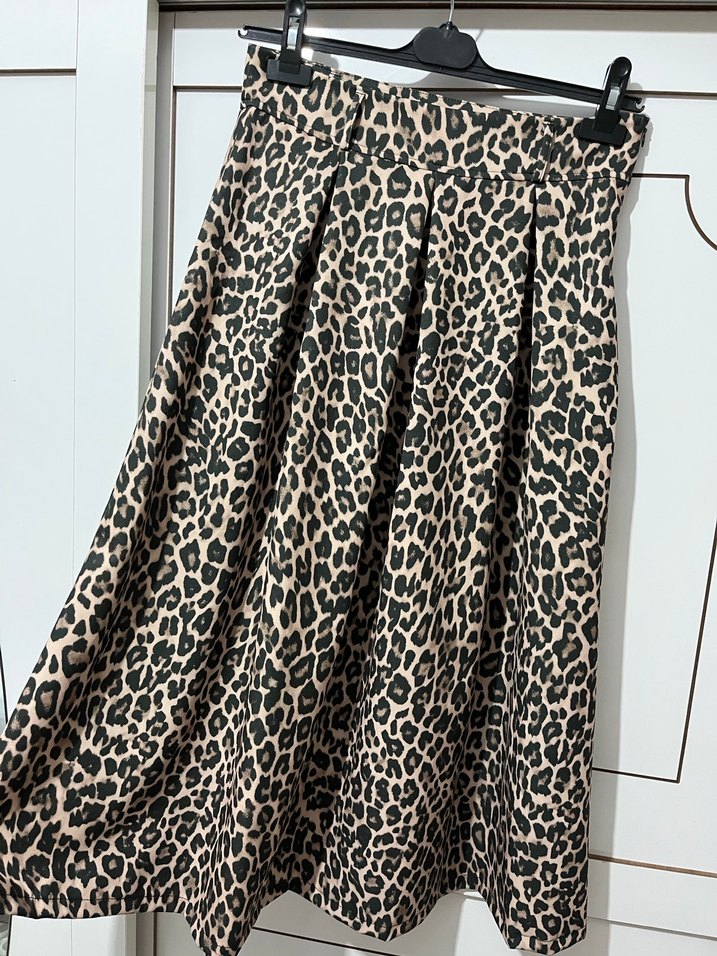 Leopar desenli, pilili ve bol kesim uzun etek, trend sokak stili için uygun.