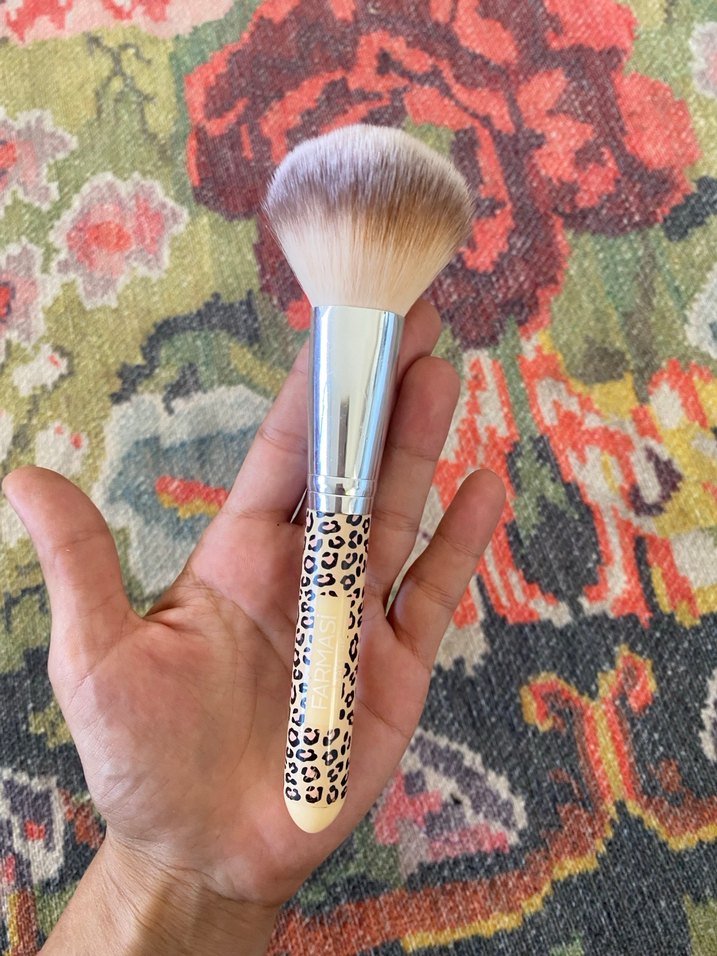 Leopar desenli sapı ve yumuşak kılları olan bej renk pudra fırçası. ️