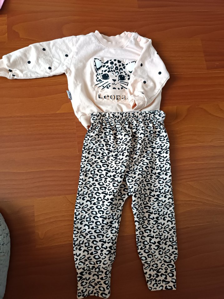 Leopar desenli renkli alt ve düğmeli pudra uzun kollu üstten oluşan bebek kız takımı. Üstte "Leopa" yazısı ve sevimli hayvan yüzü var. markası LCW değil butik ürünü