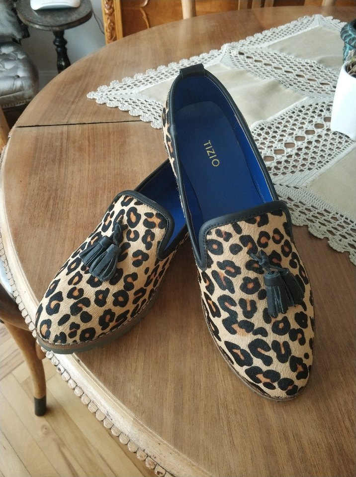 Kahverengi süet, leopar desenli, püsküllü kadın loafer. Platform topuklu, bohem ve Paris esintili, günlük kullanıma uygun. yurt dışından aldım marka temsili olarak verildi