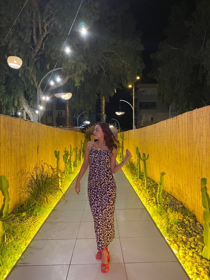 Leopar desenli, ince askılı, drapeli ve vücuda oturan bu uzun elbise, hafif sarı ve ipeksi kumaştan yapılmıştır. Romantik akşamlar ve sokak modası için uygundur.