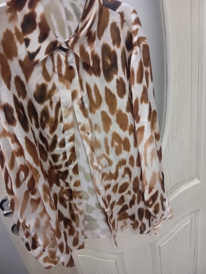 Bej renkli, leopar desenli ve detaylı saten kadın gömlek. Uzun kollu, yakalı ve bol kesim, sokak modasına uygun.