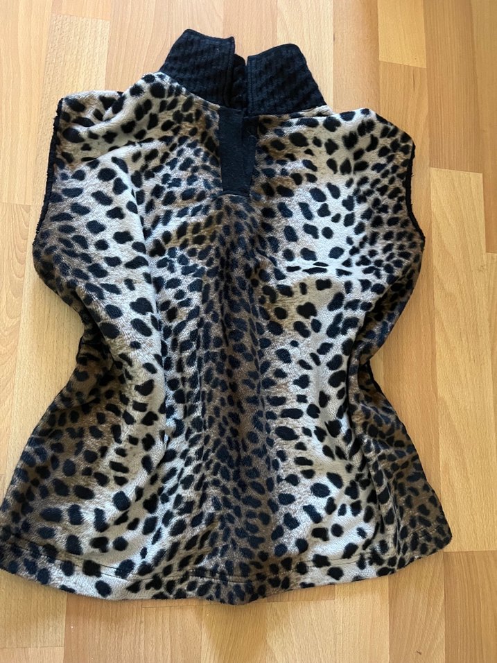 Kürk detaylı, koyu kahverengi leopar desenli sıfır kollu dıcak tutar uzunlugu 53cm beli 43