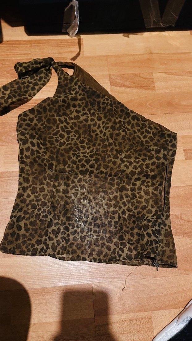 Kahverengi leopar desenli, deri, straplez ve yandan fermuar detaylı, kolsuz, bohem tarzda, vücuda oturan kadın bluz. Outdoor kullanım için uygun.