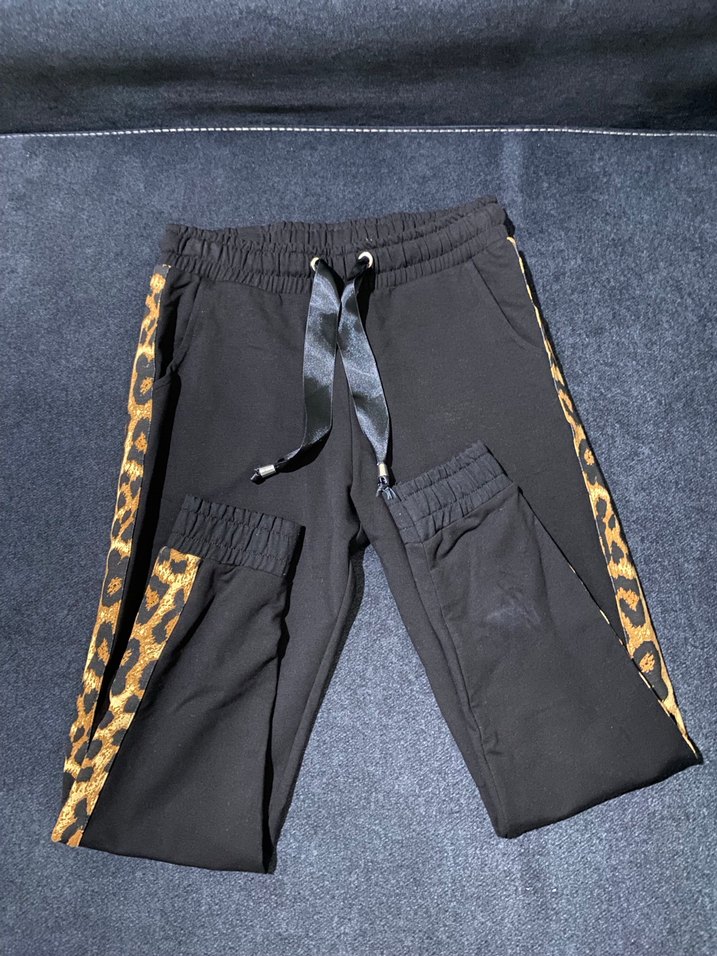 Siyah, kemerli ve bol kesim bu eşofman, yanlarda leopar desenli şeritlere sahip, yumuşak sentetik kumaştan outdoor kullanım için uygun. Hiç kullanılmamıştır
