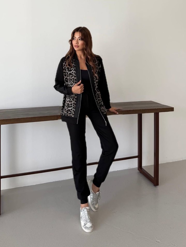Kadınlar için leopar desenli, siyah eşofman takımı. Rahat kesim, uzun kollu ve sokak modasına uygun.