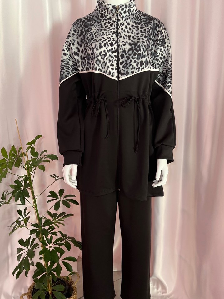 Uzun kollu, yüksek yakalı, leopar desenli siyah kadın eşofman takımı. Belden kuşaklı, bol kesim, günlük sokak stili ve athleisure tarzında rahat bir model. Xl ve xxl bedenleri mevcuttur swan _butikk