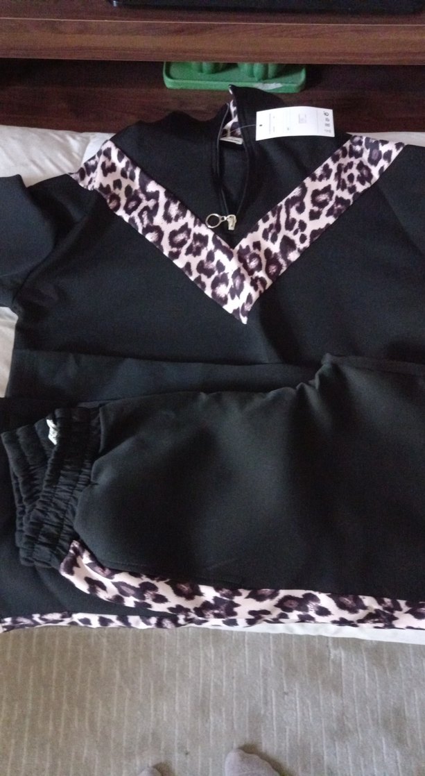 Siyah renkte, ve leopar desenli, kadın eşofman takımı