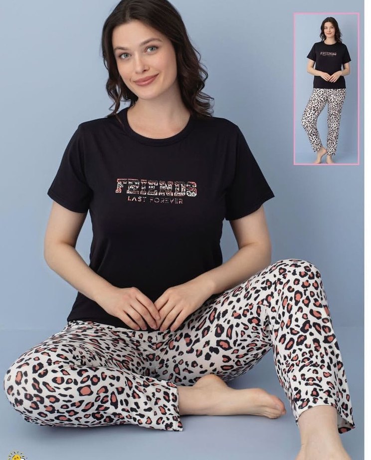 Siyah kısa kollu üst ve leopar desenli pantolonlu kadın pijama takımı. bedenlerimiz SM L XL XXL