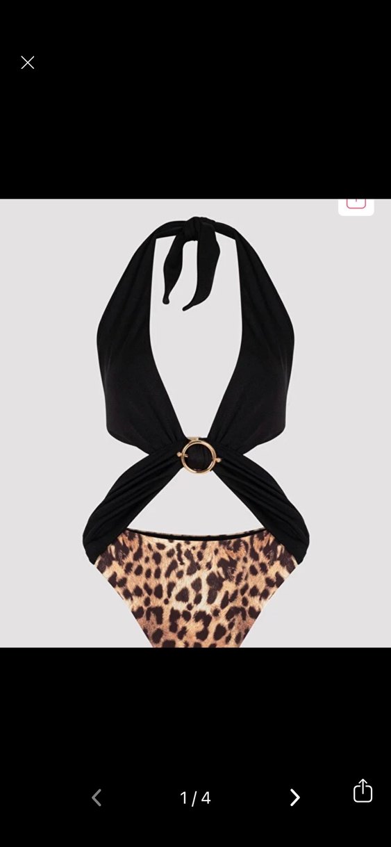 Leopar desenli alt kısmı ve siyah kemerli askılı üst kısmı olan, mini boy ve goth tarzında, dış mekanda kullanıma uygun, vücuda oturan kadın mayokini