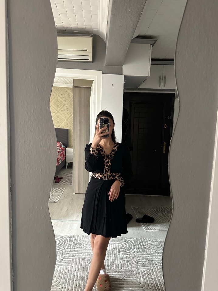 V yaka, uzun kollu siyah midi elbise, leopar desenli kemer detaylı ve bol kesimdir. Ofis için uygundur, cesur goth tarzını yansıtır.