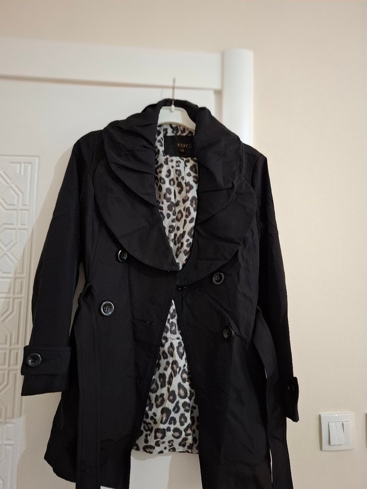 Siyah trençkot, kuşaklı bel ve kesimli yakaya sahiptir. İç kısmı leopar desenlidir, günlük kullanıma uygundur.