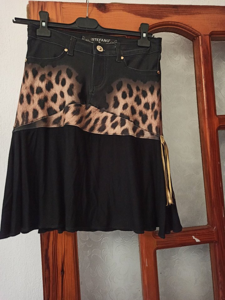 Siyah renkli, leopar desenli, kemerli ve bol kesim mini hamile eteği, sentetik kumaştan üretilmiştir.