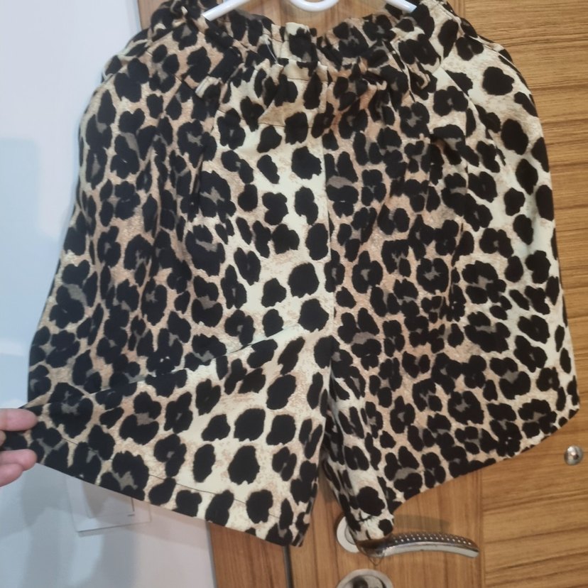 Sentetik kumaştan, leopar desenli, bol kesim, koyu kahverengi şort