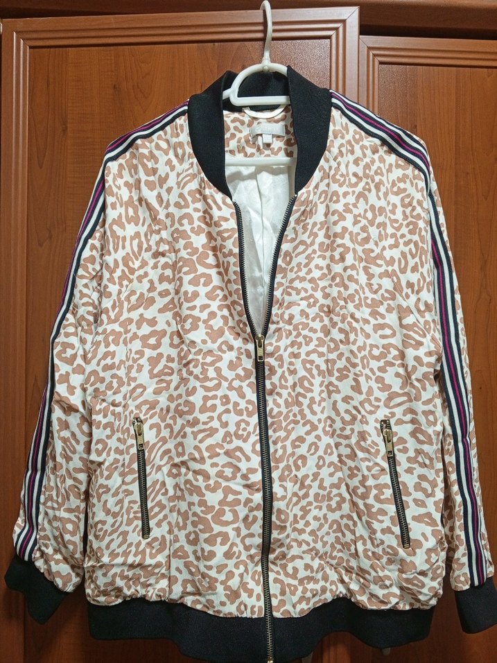 Rahat kesim, uzun kollu fermuarlı spor leopar desenli ceket. Kol detaylarında şeritler ve arka yan kısımlarında pembe desenler bulunur. Günlük kullanıma uygundur. Twist ürünü. Kumaşı beyaz üzerine camel desenli krep jorjettir ve kaçırılmaması gereken bir üründür. 40 beden.