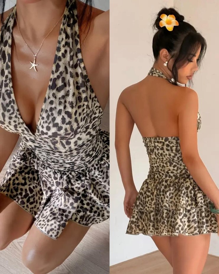 Leopar desenli, straplez yaka ve drapeli detaylara sahip, vücuda oturan mini elbise. Sentetik kumaştan, günlük kullanetiketi üzerinde saten kumaş ıma uygun şık ve çağdaş tasarım.
